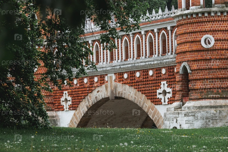 Россия. Фасонный мост в Царицынском парке в Москве летом. Царицынский парк — одна из главных туристических достопримечательностей Москвы. Россия, май 2023 г