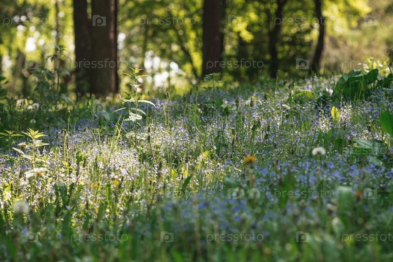Красивый естественный фон. Раннее утро в лесу с бликами от солнца. Полевые цветы Васильковая фармакопея и одуванчики на солнце