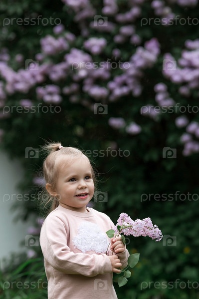 Весеннее цветение. Портрет красивой маленькой девочки 3 лет с сиреневыми цветами на природе. Детство. Малыш позирует и смотрит в камеру