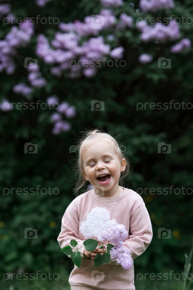 Весеннее цветение. Портрет красивой маленькой девочки 3 лет с сиреневыми цветами на природе. Детство. Малыш позирует и смотрит в камеру