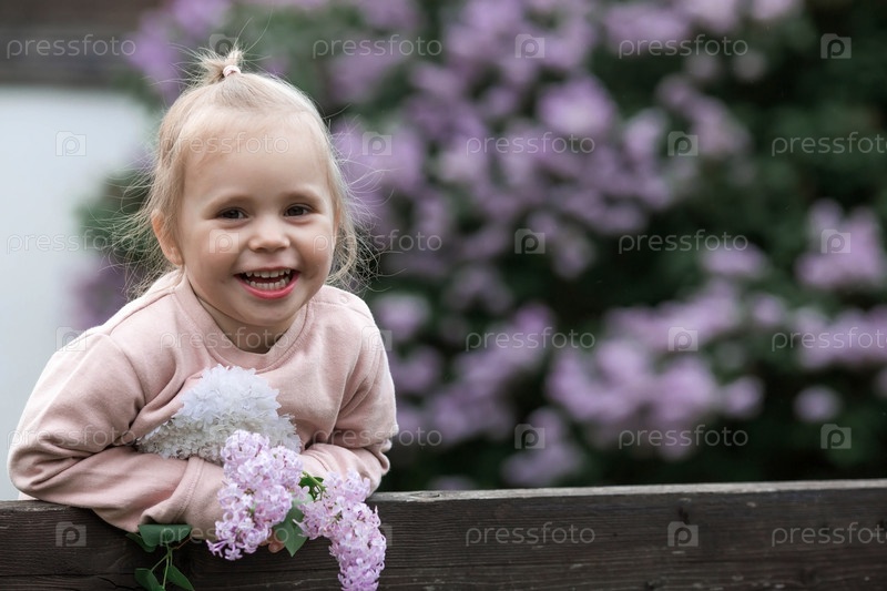 Весеннее цветение. Портрет красивой маленькой девочки 3 лет с сиреневыми цветами на природе. Детство. Малыш позирует и смотрит в камеру