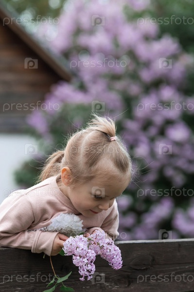 Весеннее цветение. Портрет красивой маленькой девочки 3 лет с сиреневыми цветами на природе. Детство. Малыш позирует и смотрит в камеру