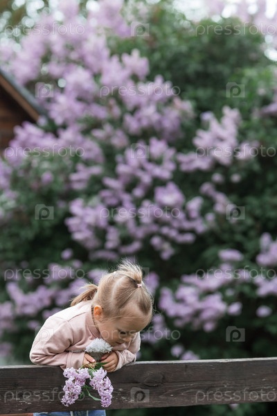 Весеннее цветение. Портрет красивой маленькой девочки 3 лет с сиреневыми цветами на природе. Детство. Малыш позирует и смотрит в камеру