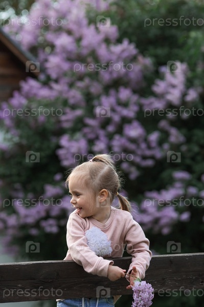 Весеннее цветение. Портрет красивой маленькой девочки 3 лет с сиреневыми цветами на природе. Детство. Малыш позирует и смотрит в камеру