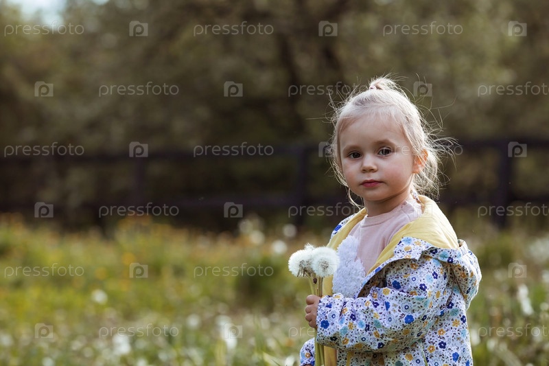 Счастливая красивая девочка 3 лет, дующая на одуванчик солнечным летним вечером. Ребенок на свежем воздухе, на природе. Заходящее солнце