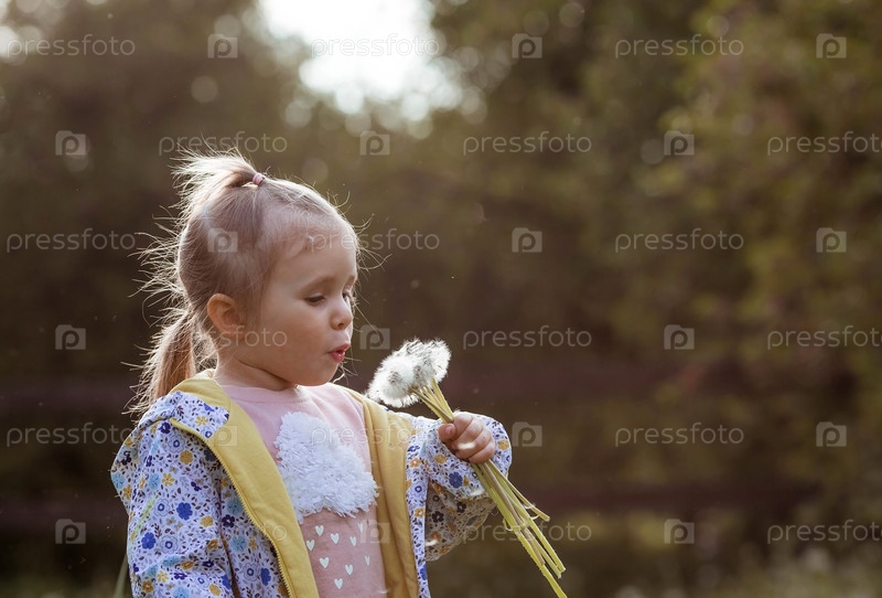 Счастливая красивая девочка 3 лет, дующая на одуванчик солнечным летним вечером. Ребенок на свежем воздухе, на природе. Заходящее солнце
