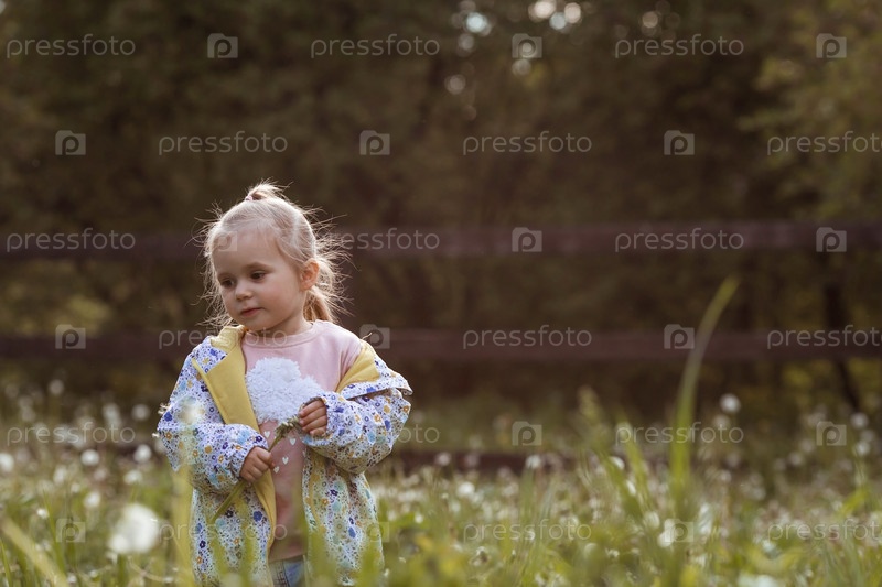 Счастливая красивая девочка 3 лет, дующая на одуванчик солнечным летним вечером. Ребенок на свежем воздухе, на природе. Заходящее солнце