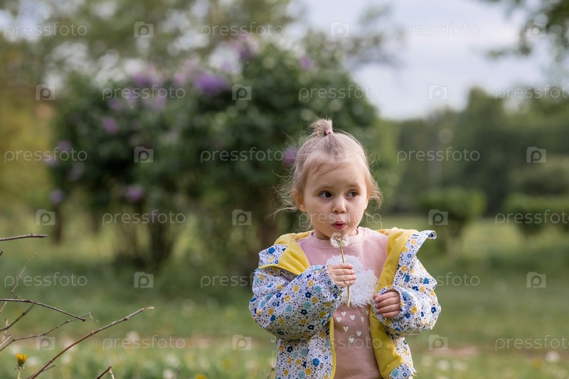 Счастливая красивая девочка 3 лет, дующая на одуванчик солнечным летним вечером. Ребенок на свежем воздухе, на природе. Заходящее солнце