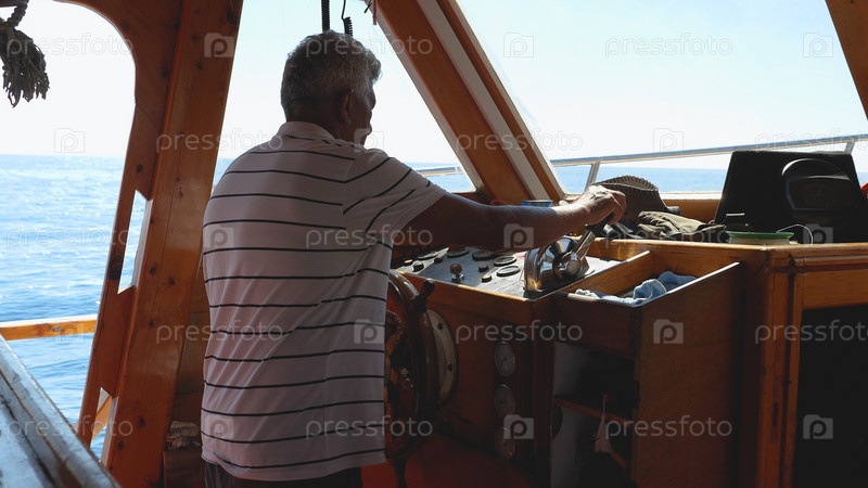 Капитан стоит у руля и контролирует направление лодки. Туристический водный транспорт для путешествий. Капитан рулит деревянным колесом. Со стороны