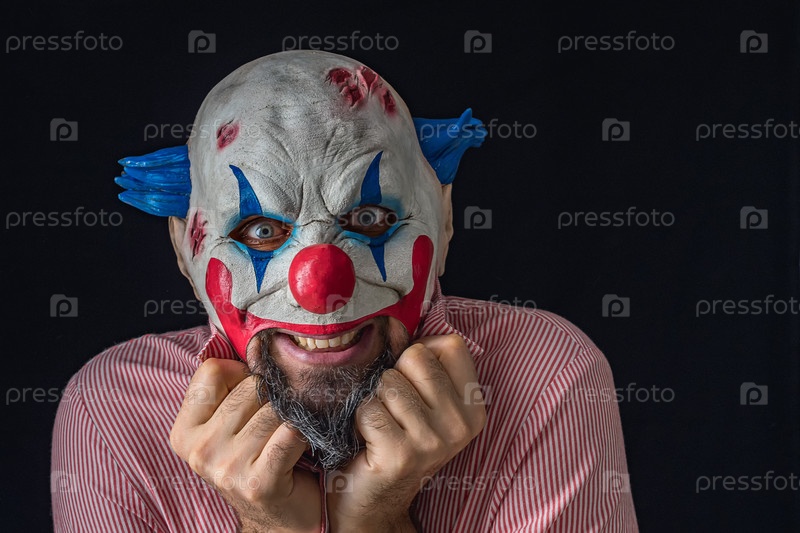 Мужчина в жуткой клоунской маске смотрит в камеру, стоя в темной комнате. Жуткий клоун держит руки рядом со своей черно-седой бородой. Закрыть. Бородатый клоун сошел с ума