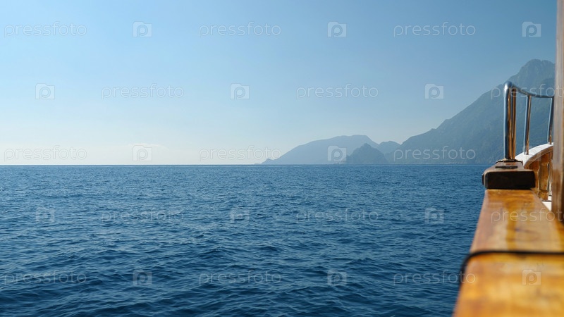 Вид сбоку на корабль в море. Деревянные перила и стальные поручни на фоне синего моря, высоких гор и неба. Прогулка по морю