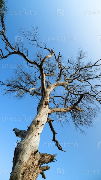 Вид снизу на сухой ствол и ветви Pinus pinea. На заднем плане ясное голубое небо. Мертвое высохшее дерево на фоне неба