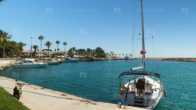 Гавань с экскурсионными катерами и яхтами. Кораблики мягко покачиваются на волнах. Красивый средиземноморский пейзаж