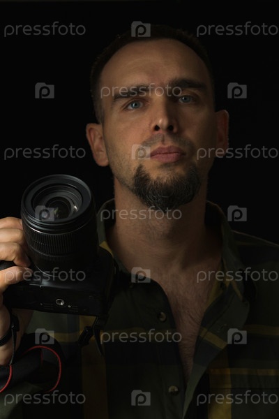 Крупный план мужчины в зеленой клетчатой рубашке с фотоаппаратом в руке. Черный фон. Бородатый фотограф смотрит в камеру. Нагрудный портрет кавказца. Низкий ключ