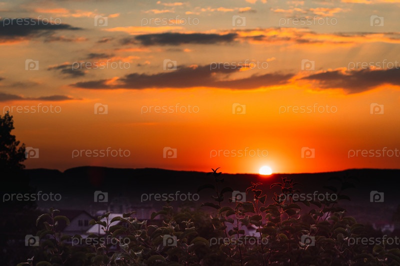Летний закат в желтых и оранжевых тонах. Красивые облака в небе. Солнце наполовину спрятано за горой. Листья молодых деревьев на переднем плане