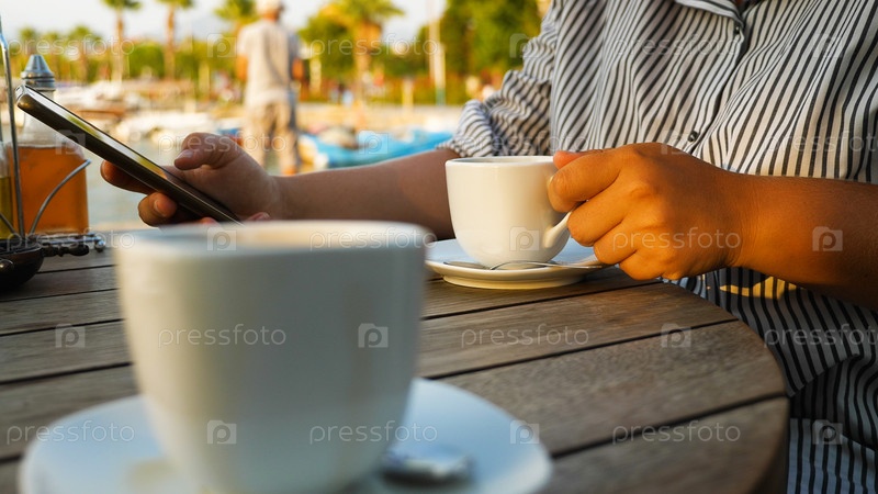 Крупный план белой кружки чая на блюдце. Против ее размытой женщины, листающей экран смартфона пальцем, пьющим чай. Красивый закатный свет. Ужин в кафе на набережной
