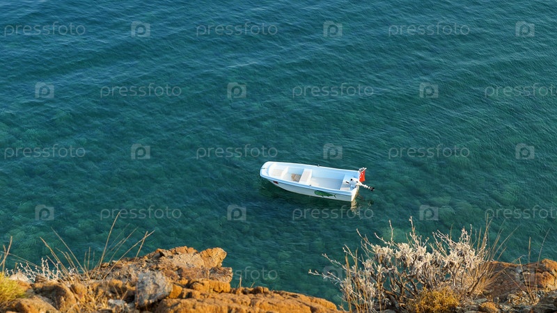 Вид с воздуха на небольшую белую моторную лодку, качающуюся на волнах у берега в красивом Средиземном море. Рыбацкая лодка у скалистого берега
