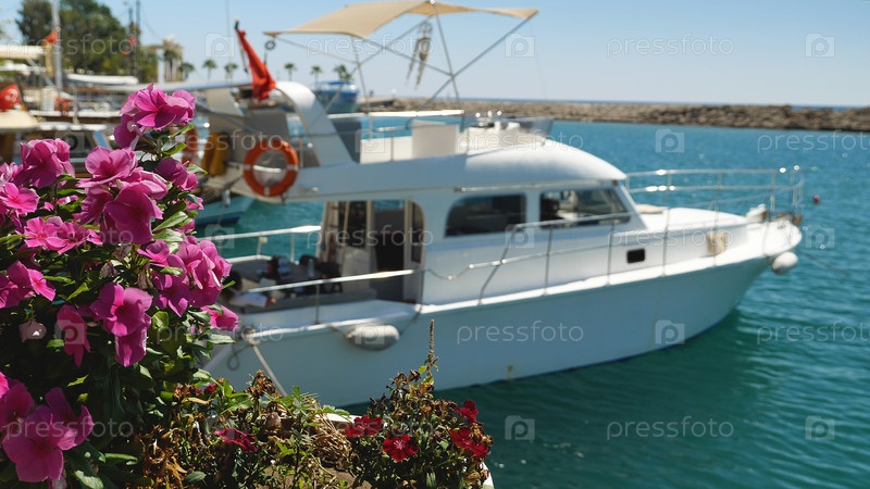 Фиолетовые цветы петунии колышутся на ветру против белого прогулочного катера. Крупный план. Гавань с катерами и яхтами на Средиземном море. Курортный город Сиде, Турция