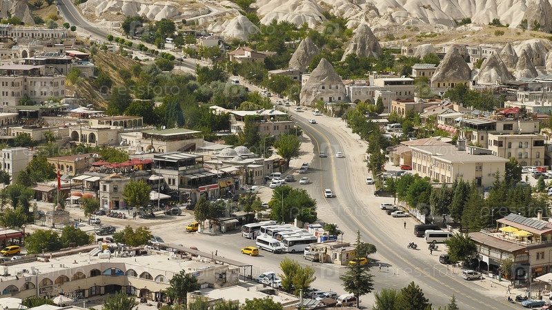 Вид на старые дома, автовокзал и улицу в Каппадокии. Вид сверху. Такси, автомобили и мотоциклы на дороге. Путешествие по Турции. Привлекательное место и популярное туристическое направление