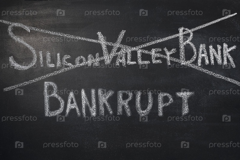 Слово Silicon Valley Bank написано и зачеркнуто на доске белым мелом. Крупный план. Место для вставки текста. Банкротство американского банка Silicon Valley Bank