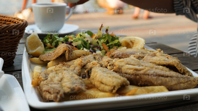 Тарелка жареной рыбы, чипсы и салат. Крупный план. Обед из свежей рыбы в кафе у моря. Чашка кофе на заднем плане