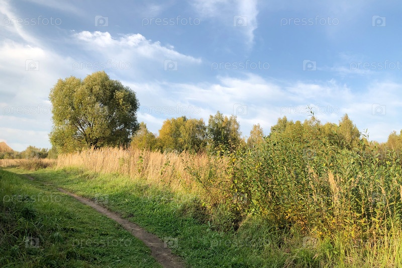 Осенний сельский пейзаж с грунтовой дорожкой через зеленый холм, покрытый высокой сухой травой
