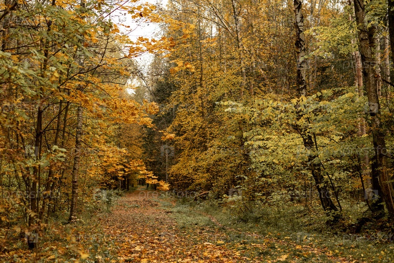Осенний пейзаж с лесной дорогой, покрытой опавшими сухими желтыми листьями