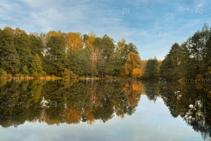 Осенние цветные деревья отражаются в озерной воде. Осенний пейзаж