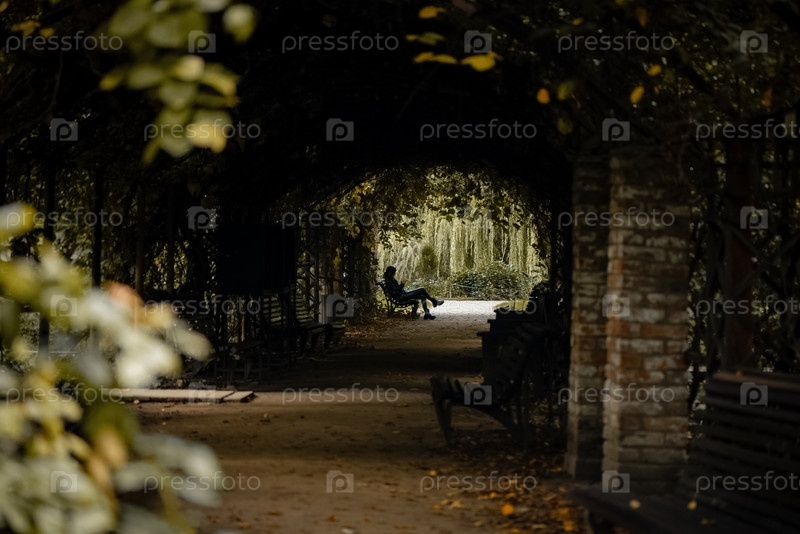 Человеческий силуэт сидит на скамейке на расстоянии тенистой беседки