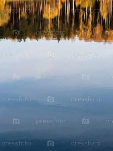 Осенние красочные деревья отражаются в спокойной поверхности воды озера