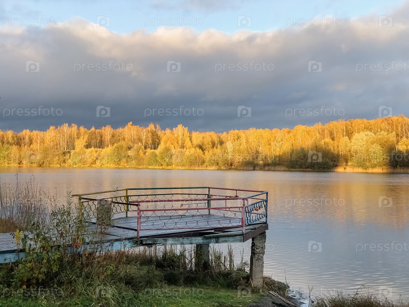 Старый деревянный пирс над неподвижной водой озера с осенними желтыми лесными деревьями на горизонте