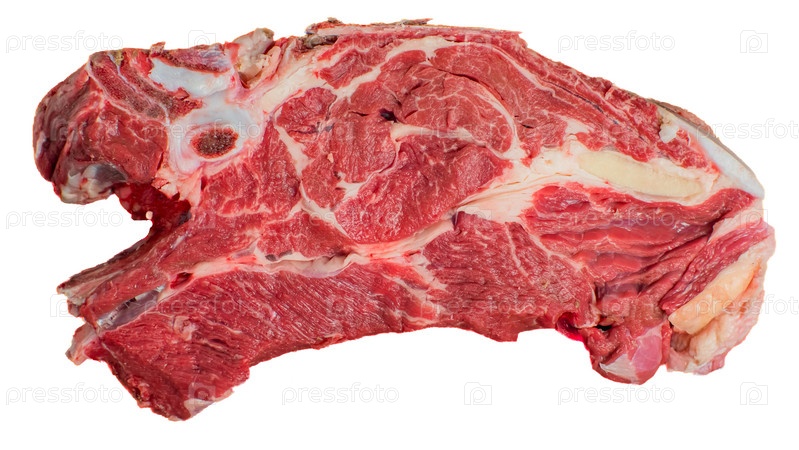 Кусок свежей говядины с костями и слоями жира. Крупный план. Отдельный на белом фоне