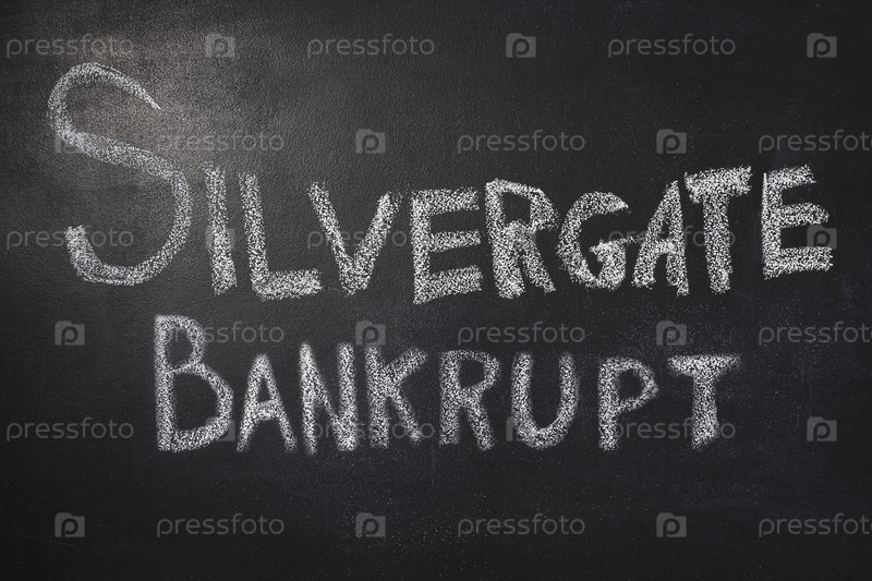 Банкротство Сильвергейт написано белой мелкой на черной доске. Крупный план. Место для вставки текста. Банкроты американского банка