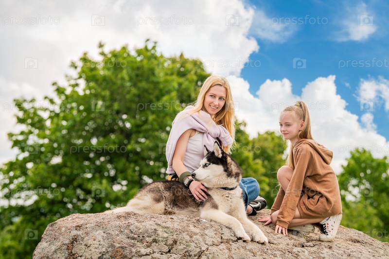Сибирский хаски и его семья сидят на камне на фоне неба. Концепция любви к животным и природе