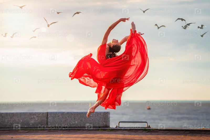 Прыгающая балерина в красной летающей юбке и трико на набережной океана или на морском пляже в окружении чаек в небе