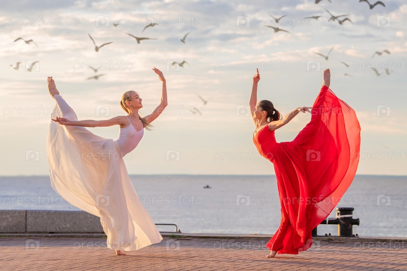 Две балерины в бело-красной летящей юбке и трико танцуют дуэтом на набережной океана в окружении чаек в небе