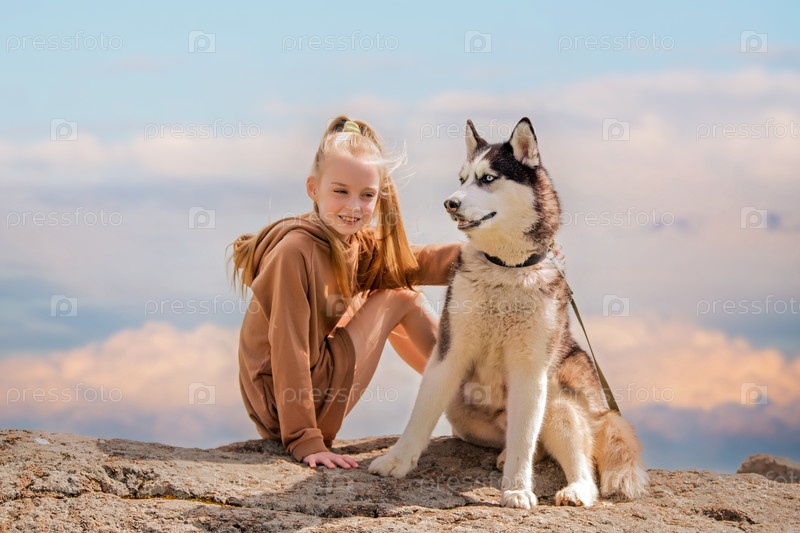Сибирский хаски и его красивая голубоглазая хозяйка сидят на камне на фоне неба. Концепция любви к животным и природе