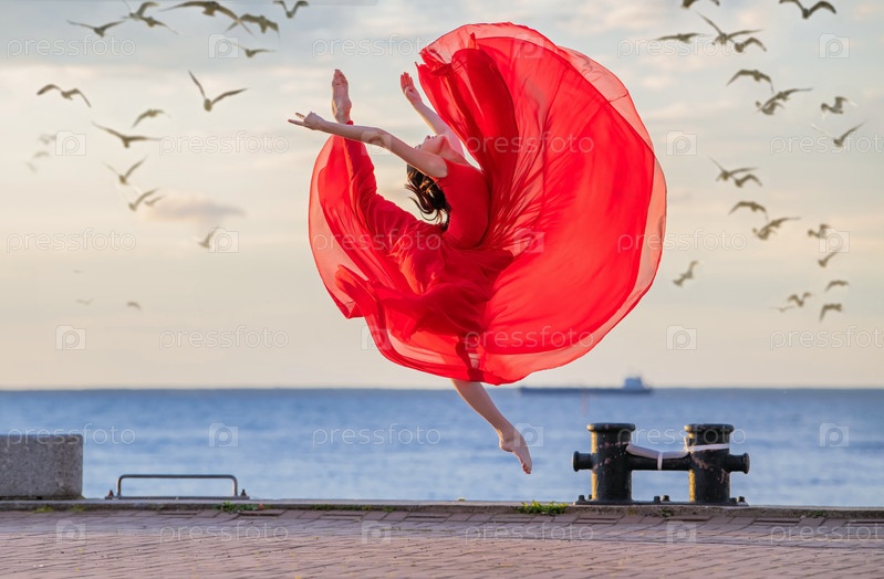 Прыгающая балерина в красной летающей юбке и трико на набережной океана или на морском пляже в окружении чаек в небе