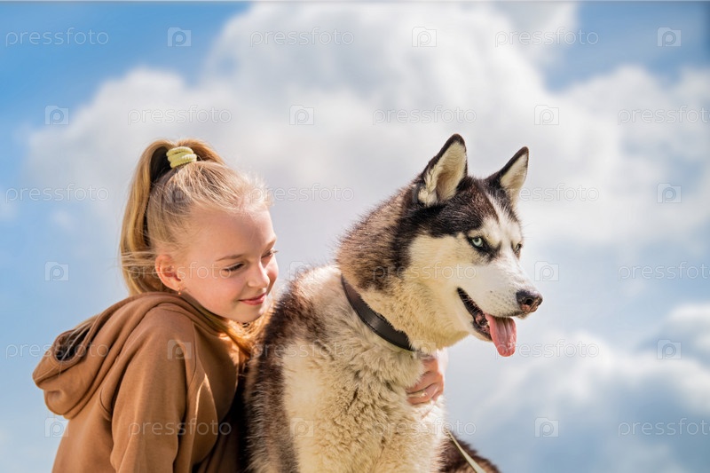Сибирский хаски и его красивая голубоглазая хозяйка сидят на камне на фоне неба. Концепция любви к животным и природе