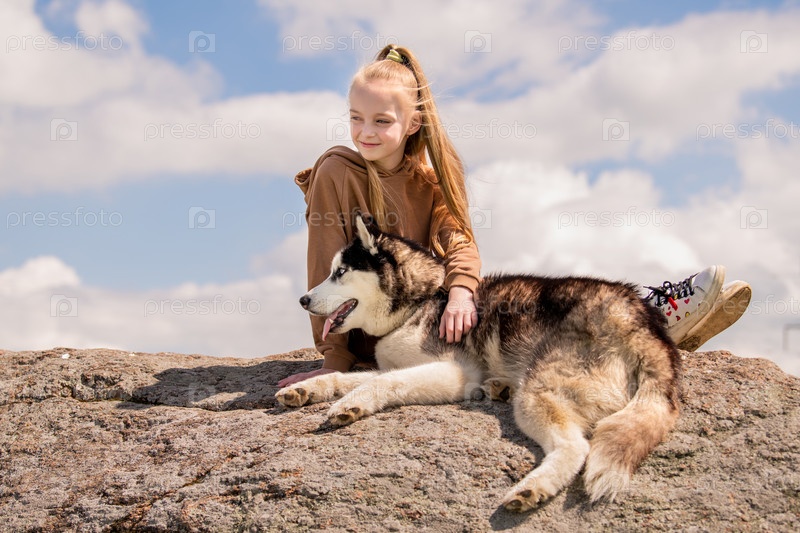 Сибирский хаски и его красивая голубоглазая хозяйка сидят на камне на фоне неба. Концепция любви к животным и природе