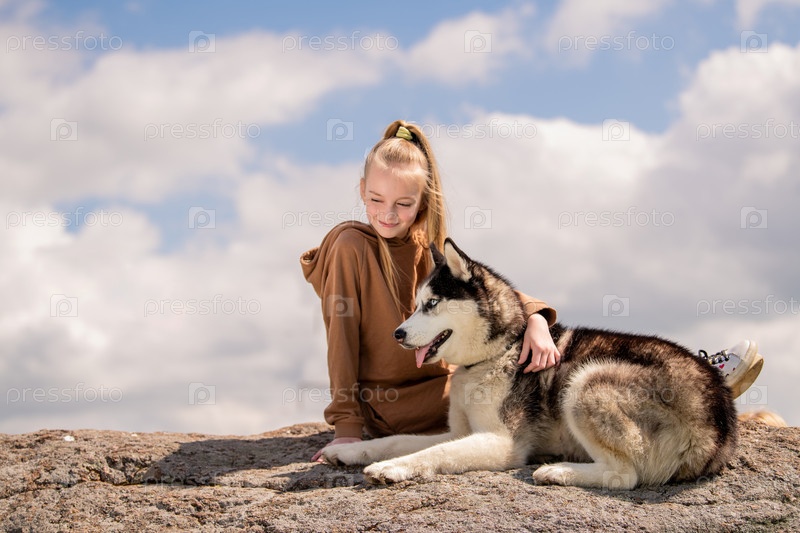Сибирский хаски и его красивая голубоглазая хозяйка сидят на камне на фоне неба. Концепция любви к животным и природе