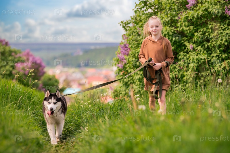 Сибирский хаски и его хозяин весело бегут по дороге вместе на фоне панорамного вида, сельский пейзаж летом
