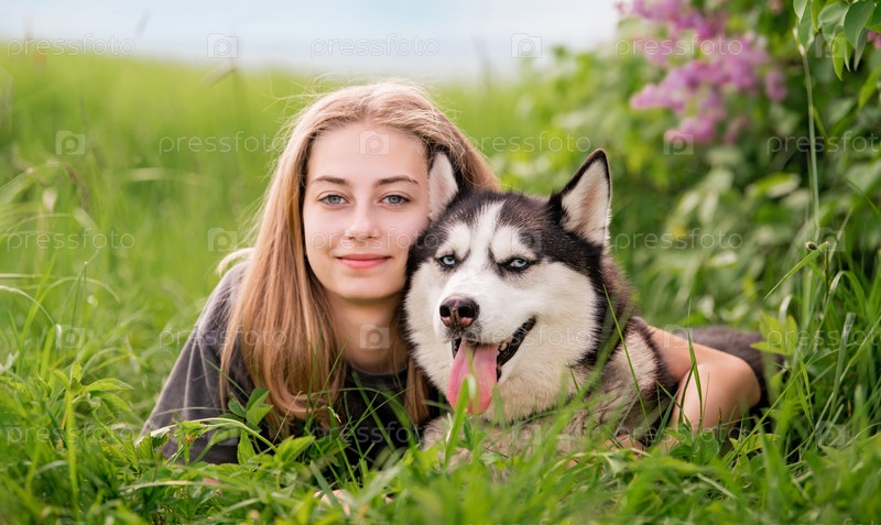 Сибирский хаски и его красивая голубоглазая хозяйка обнимаются, лежа в траве. Концепция любви к животным и природе