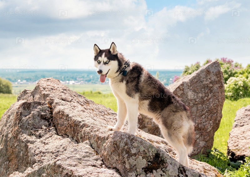 Очаровательный сибирский хаски стоит на горе на фоне панорамного пейзажа и неба. Собака на естественном фоне