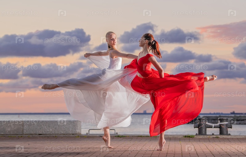 Две балерины в бело-красной летящей юбке и трико танцуют дуэтом на набережной океана или моря на фоне закатного неба
