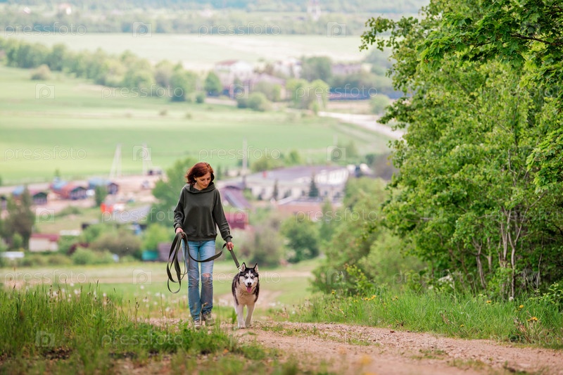 Сибирский хаски и его владелец вместе идут по дороге на фоне панорамного вида, сельский пейзаж летом