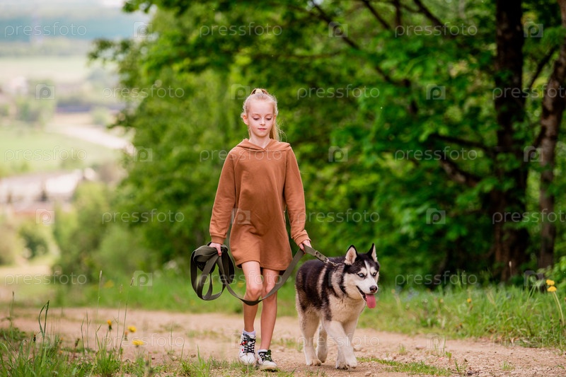 Сибирский хаски и его владелец вместе идут по дороге на фоне панорамного вида, сельский пейзаж летом