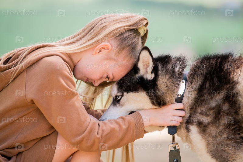 Сибирский хаски и его маленькая хозяйка обнимаются вместе на дороге на фоне сельского пейзажа летом