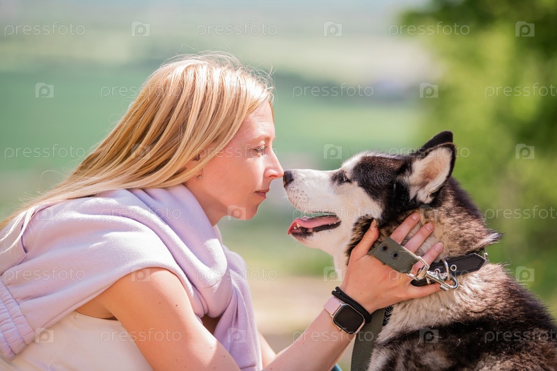 Блондинка обнимает своего пушистого друга сибирского хаски на фоне лесной дороги в солнечный день