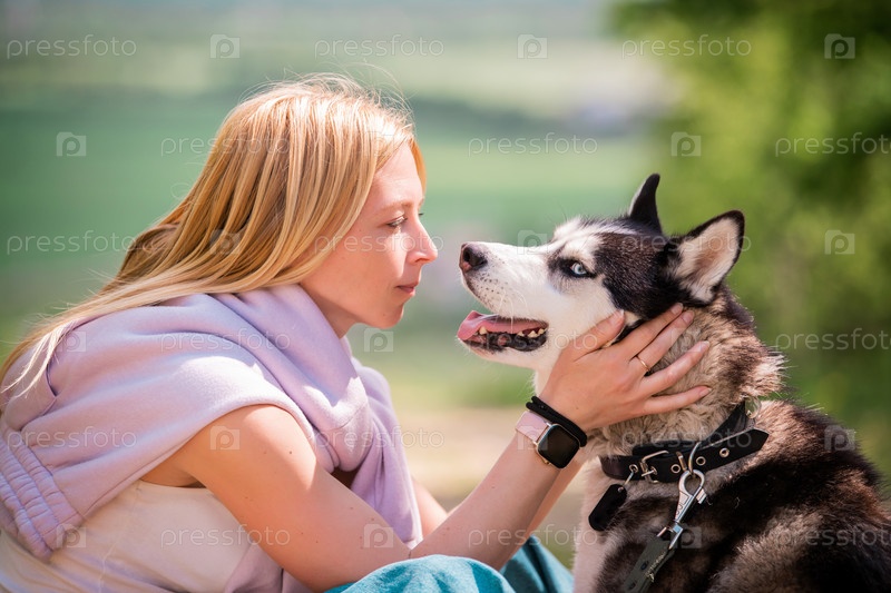 Блондинка обнимает своего пушистого друга сибирского хаски на фоне лесной дороги в солнечный день